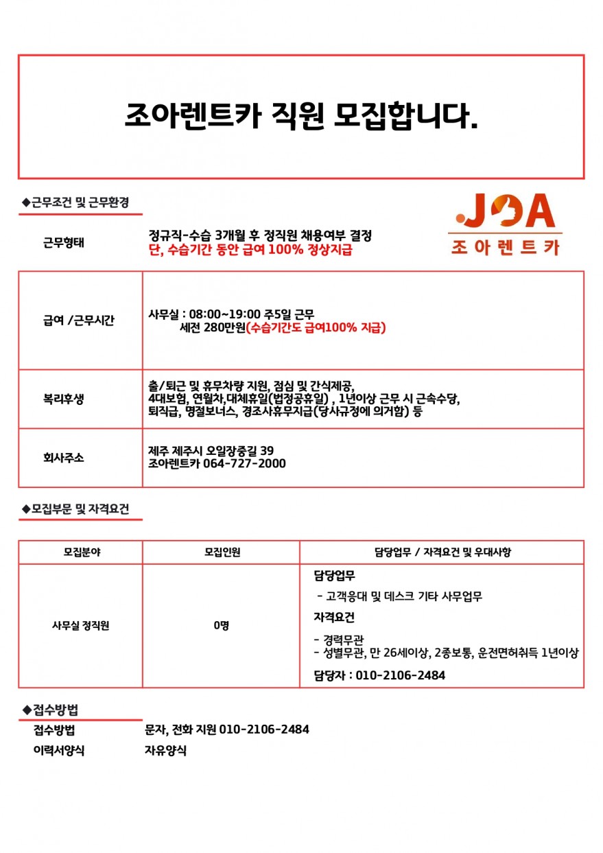 조아렌트카 정직원 모집합니다. 출퇴근/휴무 차량 지원 페이지 정보 작성자 쎄OO어 작성일24-11-29 17:09 조회2,588회 연락처 010-2106-2484 급여 월급 : 280만원 관련링크 본문 주소 : 제주특별자치도 제주시 오일장중길 39 조아렌트카 이전글 다음글 목록