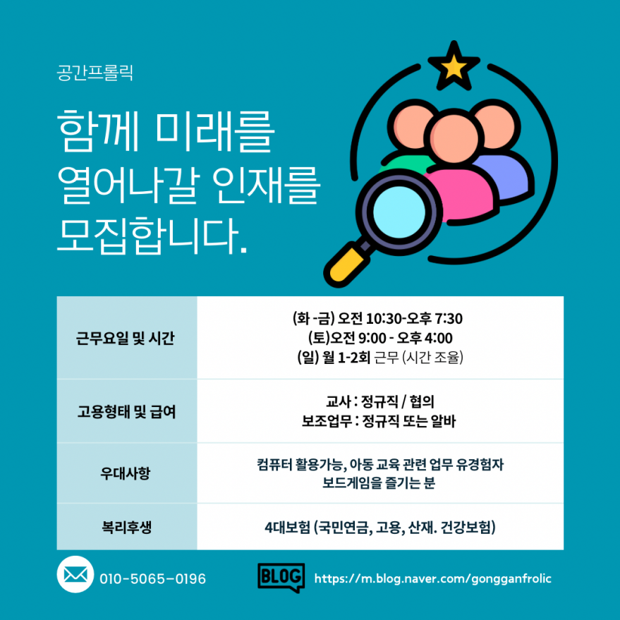 과학, 미술 교사 및 보조업무 담당자 모집. 페이지 정보 작성자 GOOOOOn 작성일24-11-27 10:21 조회2,627회 연락처 010-5065-0196 급여 월급 : 협의 관련링크 본문 공간프롤릭은 어린이 융합 프로젝트 놀이 공간입니다. 주소 : 제주특별자치도 제주시 1100로 3198-20 공간프롤릭 101-2호 이전글 다음글 목록