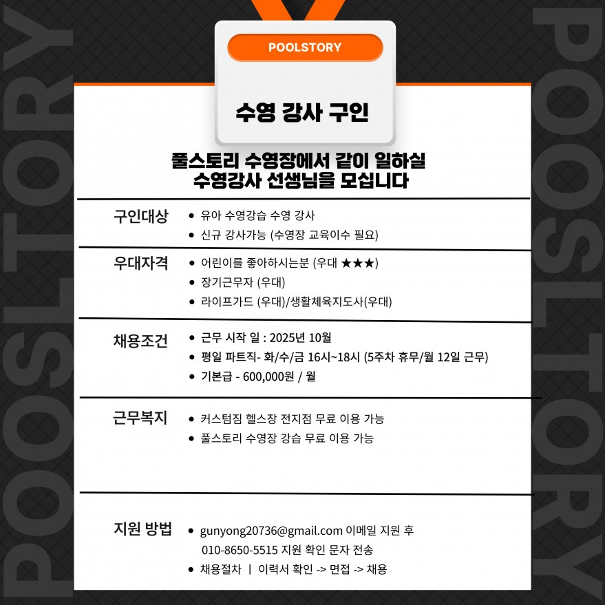 [제주]풀스토리 수영장 평일 파트 체용(여자 강사 선생님) 페이지 정보 작성자 pOOOOOOOy 작성일25-09-09 14:10 조회430회 연락처 010-8650-5515 급여 월급 : 600000 관련링크 본문 주소 : 제주특별자치도 제주시 연사6길 57 지하1층 풀스토리수영장 이전글 다음글 목록