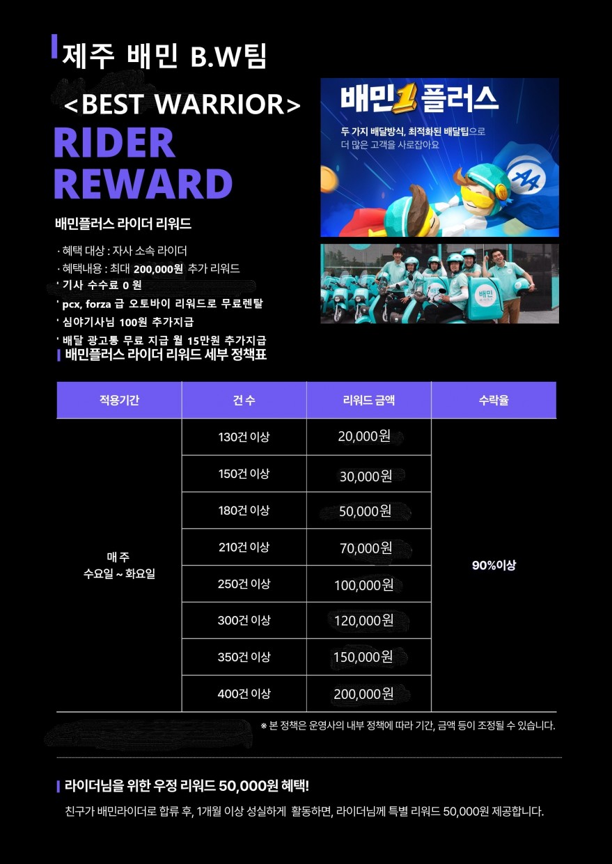 배민+BW팀 라이더 모집 심야자체할증! 일주일 개인 20만원 리워드지급! 오토바이 무료렌탈! 광고비용 지급!