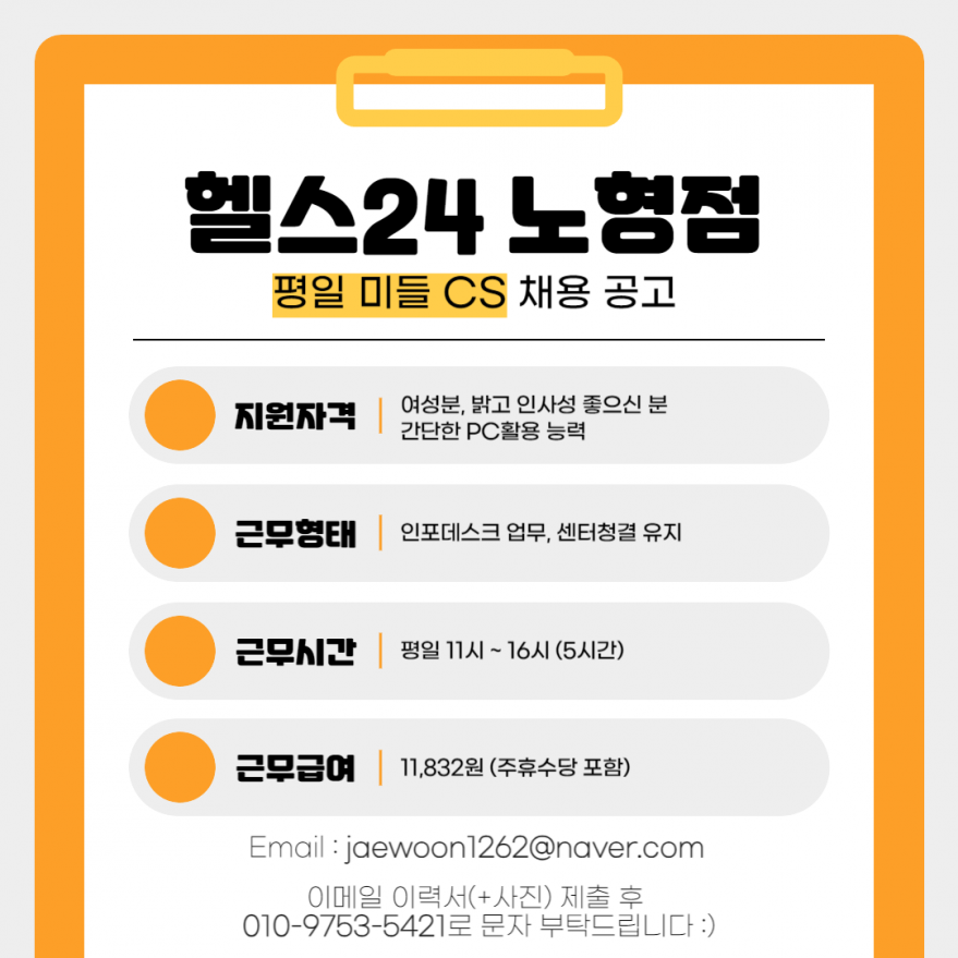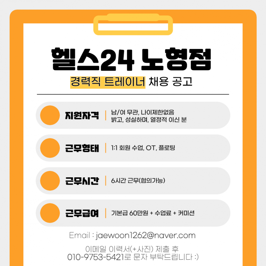♥♥♥재밌게 일 할 사람♥♥♥ 페이지 정보 작성자 헬OOOOOOO점 작성일24-10-25 17:50 조회2,718회 연락처 010-9753-5421 급여 협의 : 350만원 관련링크 본문 헬스24 노형점에서 즐겁게 일 할 사람 구해요!이력서 지원 후 문자 주시면 연락 드리겠습니다♥ 주소 : 제주특별자치도 제주시 연북로 54 이전글 다음글 목록
