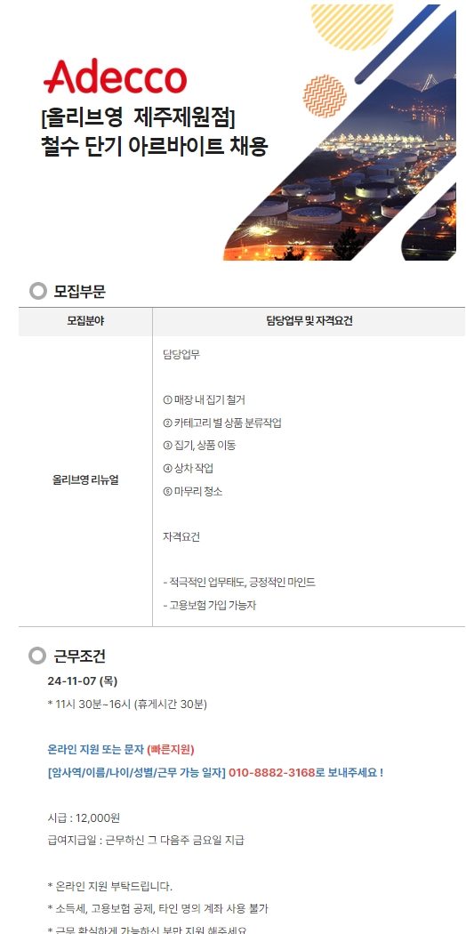 [일4시간/48000원] 올리브영 매장 리뉴얼 1일 알바 채용 페이지 정보 작성자 편OOOOOO체 작성일24-10-25 09:58 조회3,337회 연락처 010-8882-3168 급여 일당 : 48000 관련링크 본문 *여성 TO 마감* 주소 : 제주특별자치도 제주시 신광로 57 제주제원점 올리브영 이전글 다음글 목록