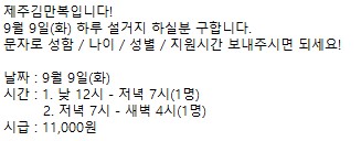 9월9일_하루_근무자_구인합니다 페이지 정보 작성자 제OOO복 작성일25-09-07 12:37 조회657회 연락처 010-5685-0355 급여 시급 : 11000 관련링크 본문 제주김만복 주소 : 제주특별자치도 제주시 오라로 41 제주김만복 본점 이전글 다음글 목록