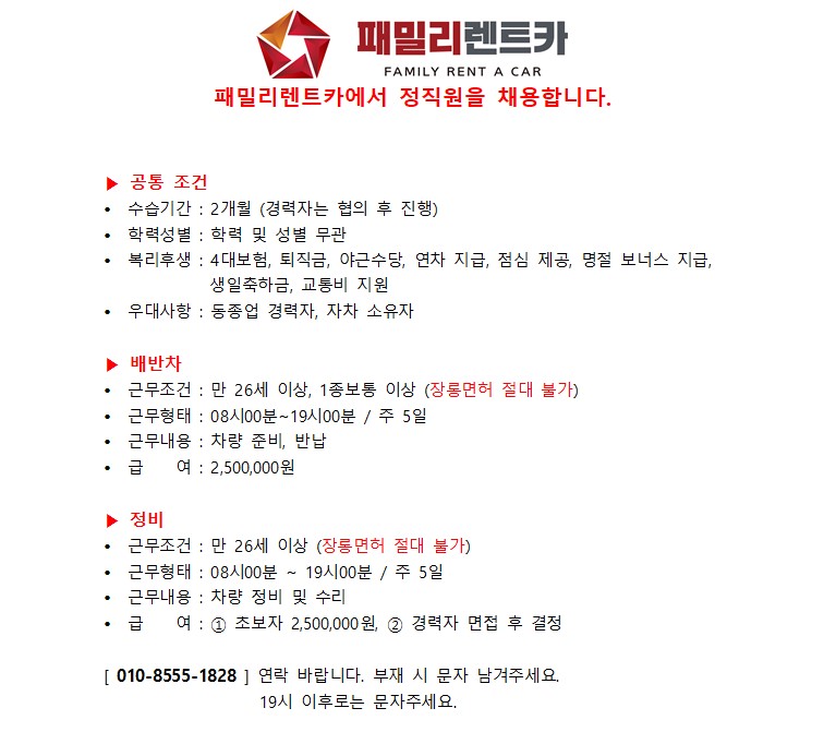 패밀리렌트카 배반차 직원 구인 페이지 정보 작성자 패OOOO카 작성일24-10-20 13:00 조회2,902회 연락처 010-8555-1828 급여 월급 : 250만+@ 관련링크 본문 연락주세요. 주소 : 제주특별자치도 제주시 제성1길 67 이전글 다음글 목록