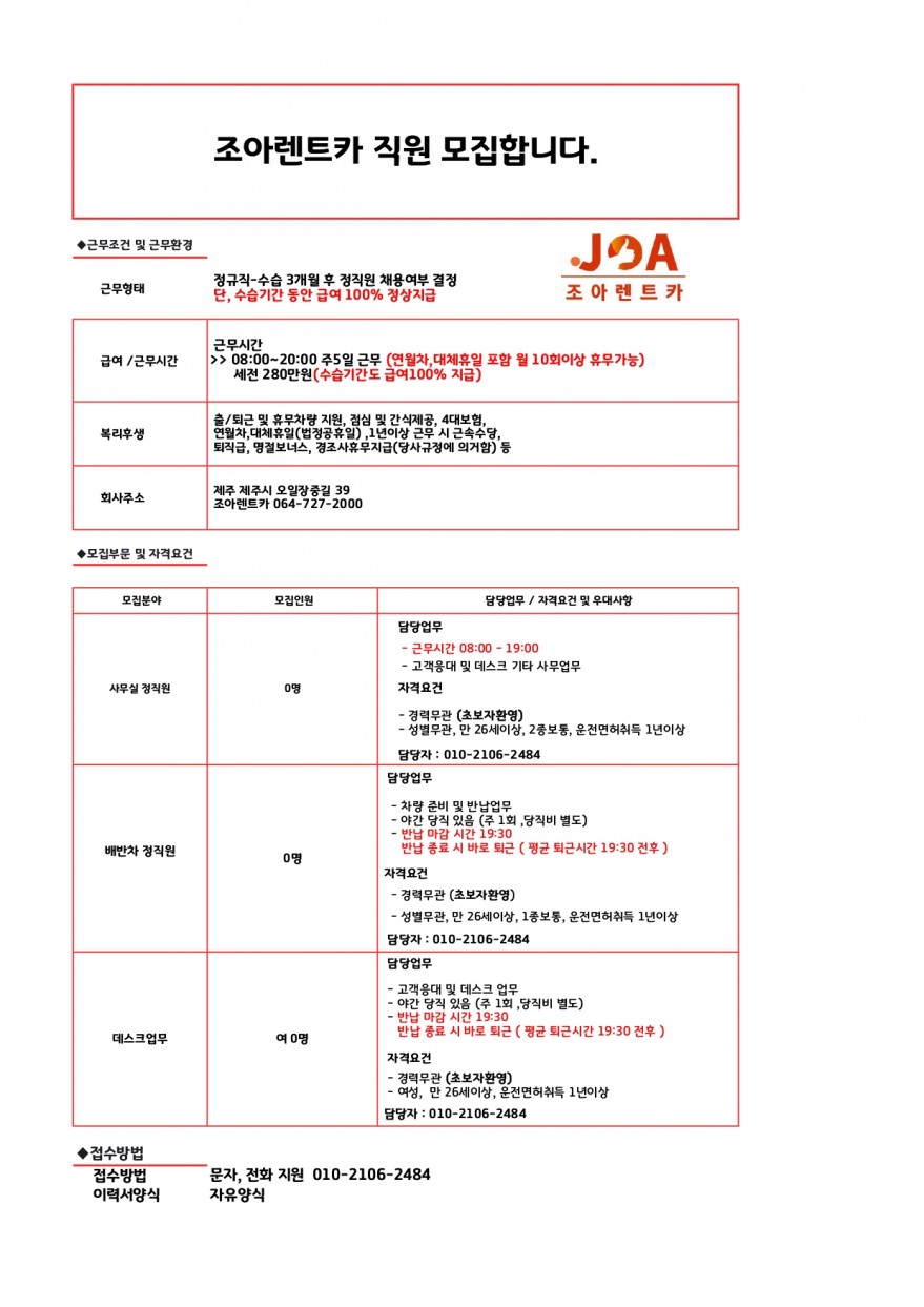 ⭐⭐໒(◉ᴥ◉)७조아렌트카 / 출퇴근휴무차량지원 / 예약실데스크배차 페이지 정보 작성자 jOOOOa 작성일25-12-03 09:11 조회850회 연락처 010-2106-2484 급여 월급 : 280만원 관련링크 본문 주소 : 제주특별자치도 제주시 오일장중길 39 조아렌트카 이전글 다음글 목록