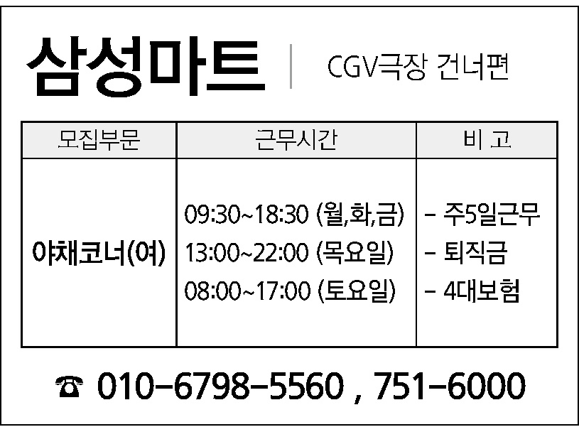 ((마트직원구합니다)) 페이지 정보 작성자 마트 작성일24-09-30 23:56 조회3,190회 연락처 010-6798-5560 급여 협의 : . 관련링크 본문 1. 야채코너(여) 2. 계산원 (여) 월 ~ 금 (18:00 ~ 23:00) 시급 10,000 이상 초보자 가능!경력자 우대 합니다! 주소 : 제주특별자치도 제주시 서광로29길 4 이전글 다음글 목록