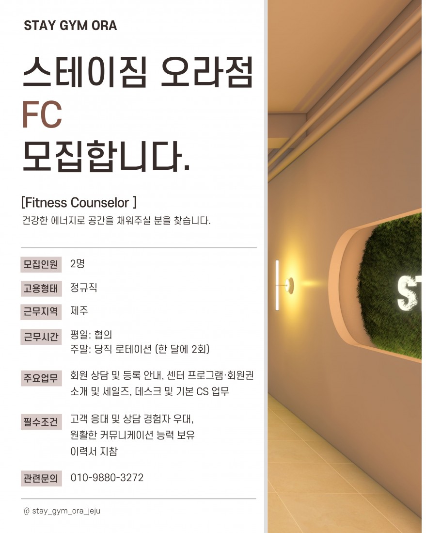 BK 스테이컴퍼니 "스테이짐 오라점"에서 함께 할 인재를 찾습니다.