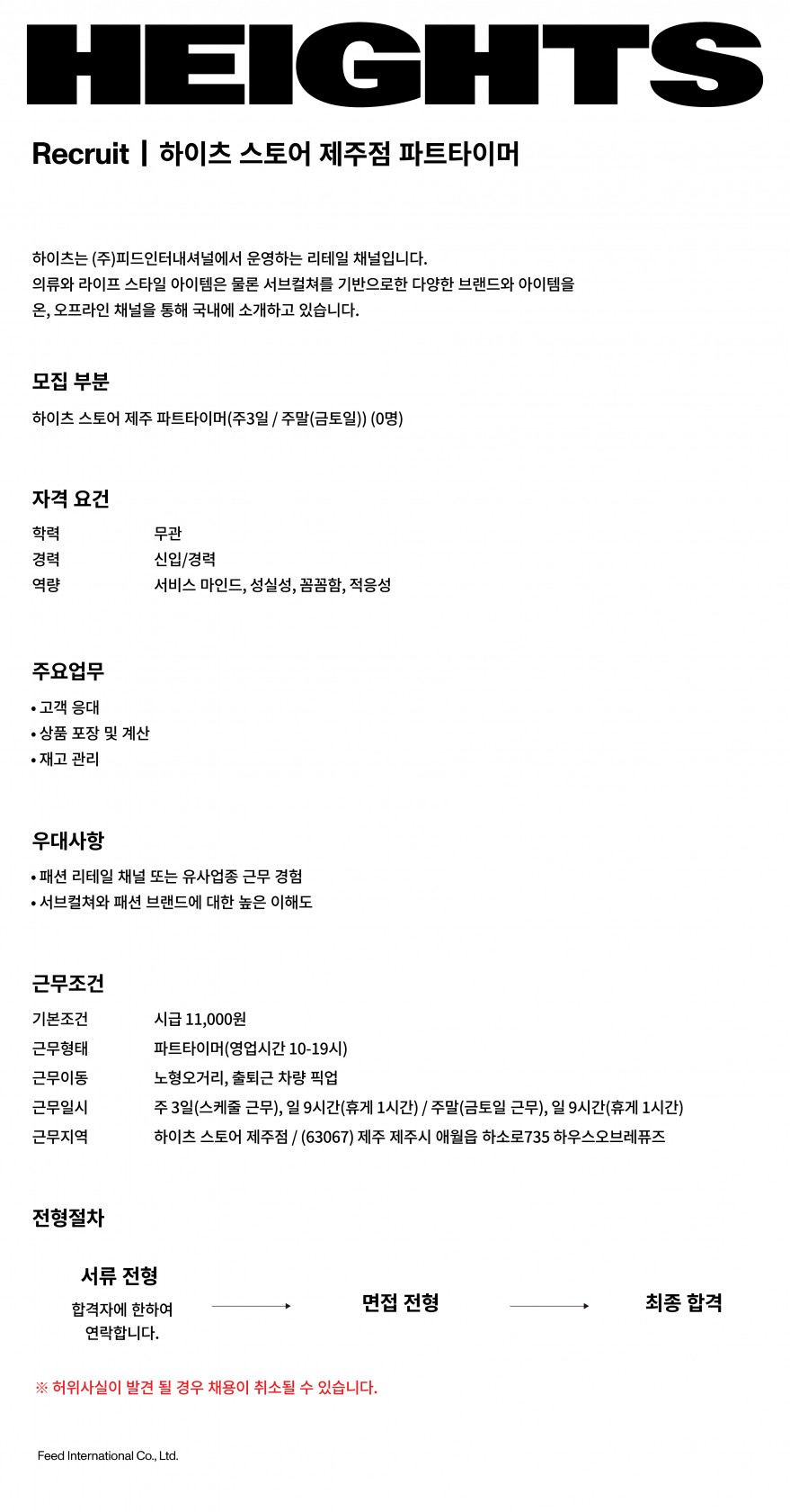 HEIGHTS 하이츠 제주 파트타이머 페이지 정보 작성자 jOOOOOu 작성일25-11-25 18:21 조회1,293회 연락처 010-9032-9337 급여 시급 : 11000 관련링크 본문 접수 기간 및 방법• 접수 기간: 채용 시 마감• 제출 서류: 이력서 및 경력 기술서 첨부 필수• 접수 방법: recruit@feedintl.com 주소 : 제주특별자치도 제주시 애월읍 하소로 735 이전글 다음글 목록