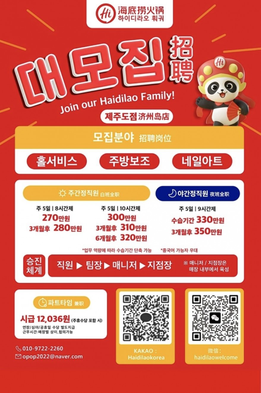 하이디라오 제주점 정직원,파트직원 구합니다.