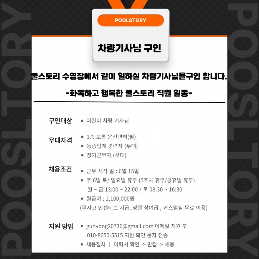 풀스토리 수영장에서 같이 일하실 차량기사님을 구인합니다. 페이지 정보 작성자 pOOOOOOOy 작성일24-06-03 14:05 조회9,740회 연락처 010-8650-5515 급여 월급 : 210만원 관련링크 본문 풀스토리 수영장에서 같이 일하실 차량기사님을 구인합니다! 이력서 제출후 문자 한번 부탁드립니다 주소 : 제주특별자치도 제주시 연사6길 57 지하 1층 풀스토리 수영장 이전글 다음글 목록