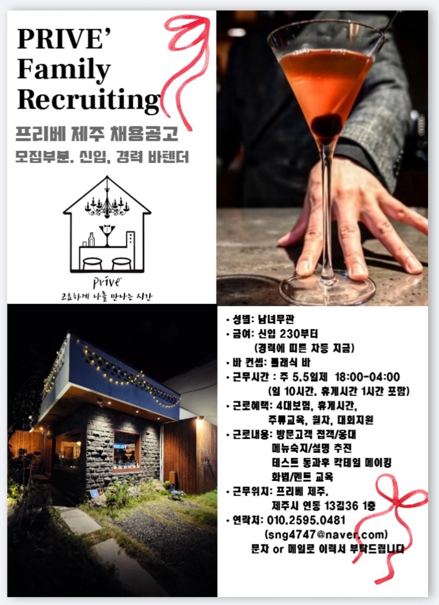 제주 프리베에서 함께 하실 바텐더 모집합니다 페이지 정보 작성자 프O베 작성일25-02-19 04:56 조회1,420회 연락처 010-2595-0481 급여 월급 : 230 관련링크 본문 프리베에서 신입. 경력 바텐더 모집합니다 주소 : 제주특별자치도 제주시 연동13길 36 1층 이전글 다음글 목록