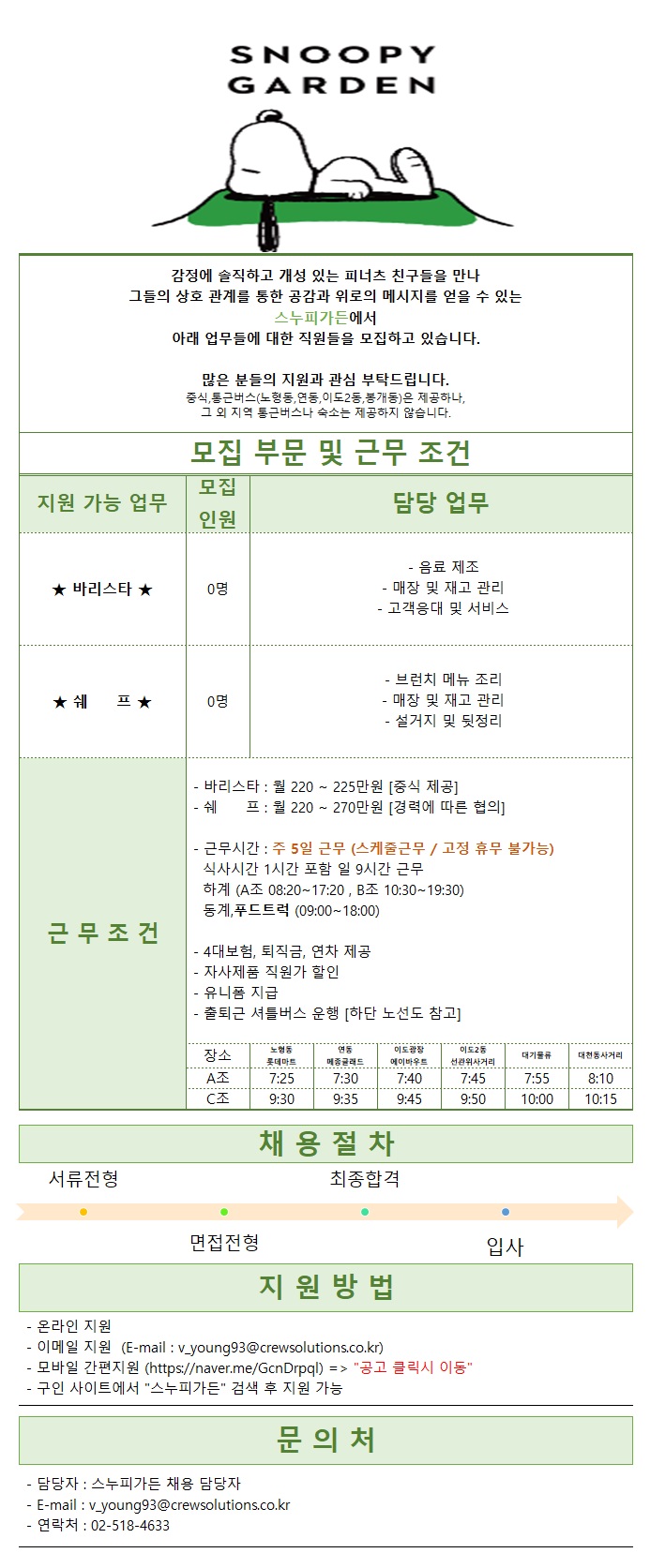 [스누피가든] 바리스타 및 레스토랑 주방 보조(셰프,조리,요리) 직원 모집