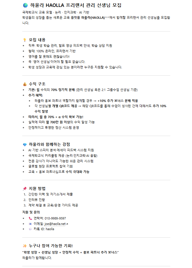 하올라 HAOLLA 프리랜서 관리 선생님 모집 페이지 정보 작성자 하OOOOOOOOO표 작성일25-08-28 16:20 조회505회 연락처 010-9989-9597 급여 협의 : 실적에 따라 월 700 만 이상도 가능 관련링크 본문 첨부 이미지 확인! 주소 : 제주특별자치도 제주시 오라이동 1202-1 1층 이전글 다음글 목록