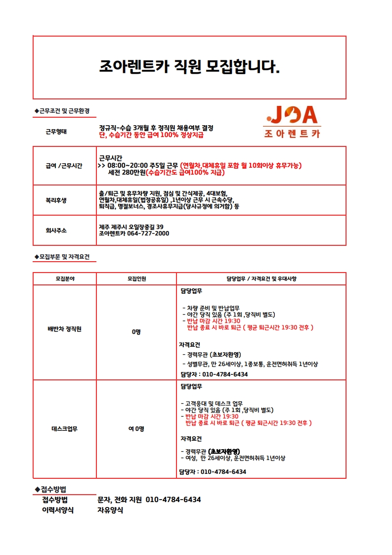 ✿˘◡˘✿ 조아렌트카 / 출퇴근 휴무차량 지원 / 데스크 배차 정직원 ✿˘◡˘✿ 페이지 정보 작성자 쎄OO어 작성일25-10-12 17:44 조회977회 연락처 010-4784-6434 급여 월급 : 280만원 관련링크 본문 주소 : 제주특별자치도 제주시 오일장중길 39 조아렌트카 이전글 다음글 목록