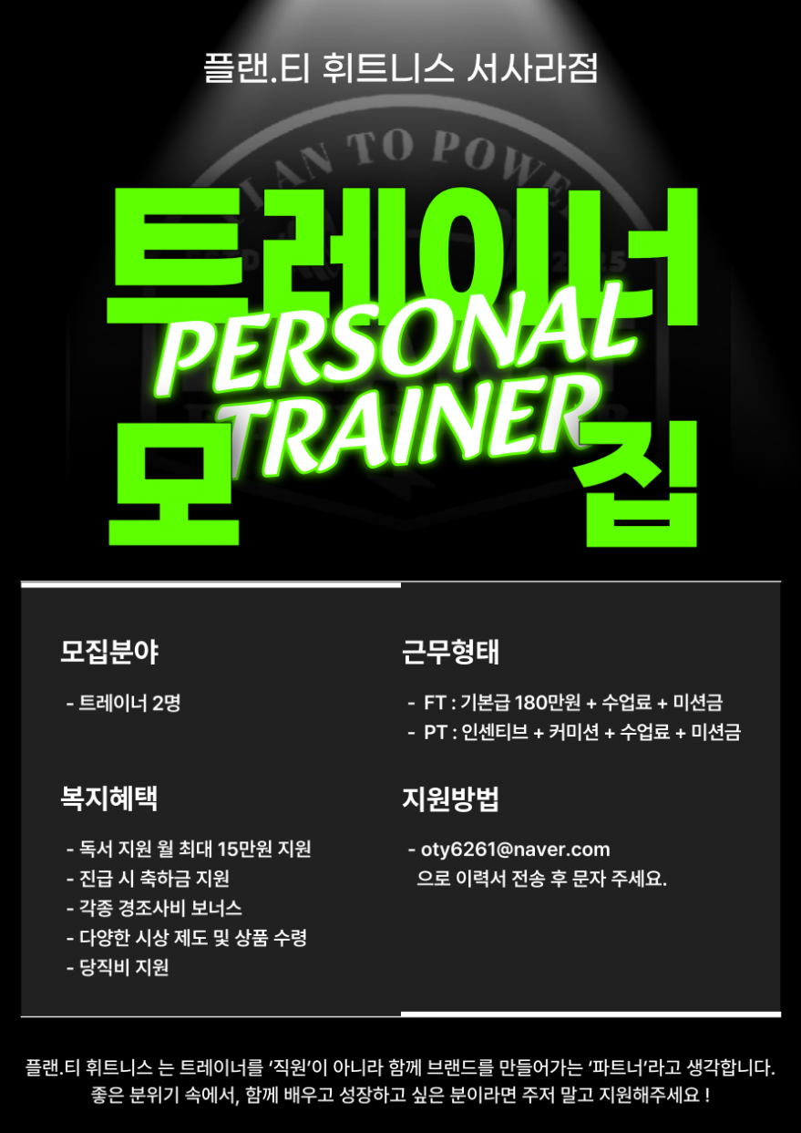 신규 오픈한 플랜.티 휘트니스 서사라점에서 같이 성장할 인재를 모집합니다 !