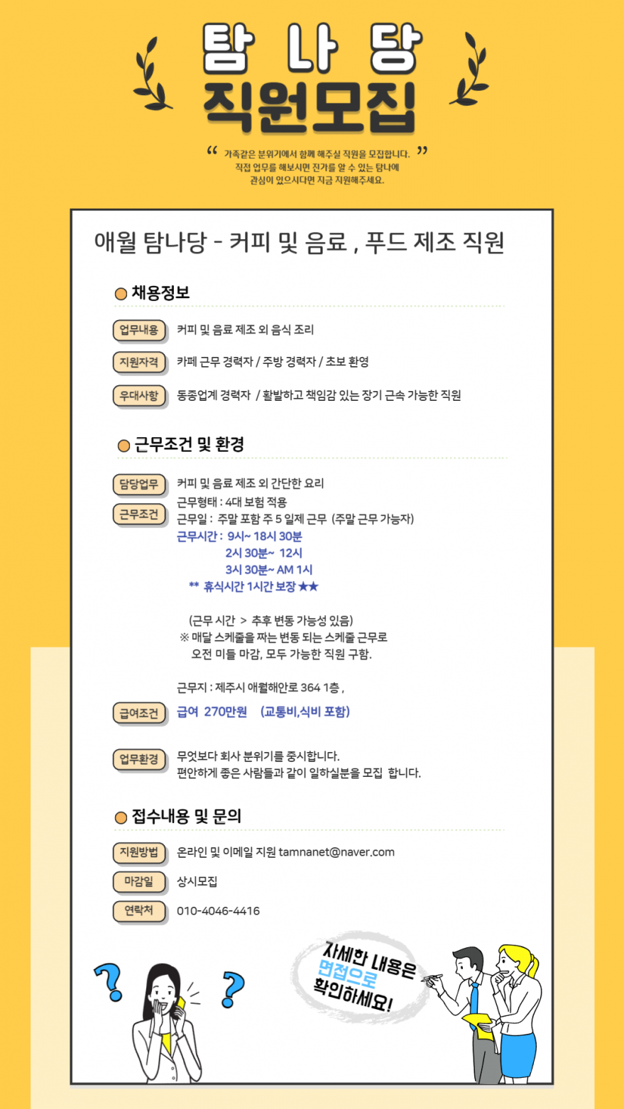 주 5일제 애월 카페 직원 모집/ 급여 270만원 페이지 정보 작성자 탐O당 작성일25-08-20 09:19 조회567회 연락처 010-4046-4416 급여 월급 : 270만원 관련링크 본문 // 주소 : 제주특별자치도 제주시 애월읍 애월해안로 364 1층 탐나넷 이전글 다음글 목록