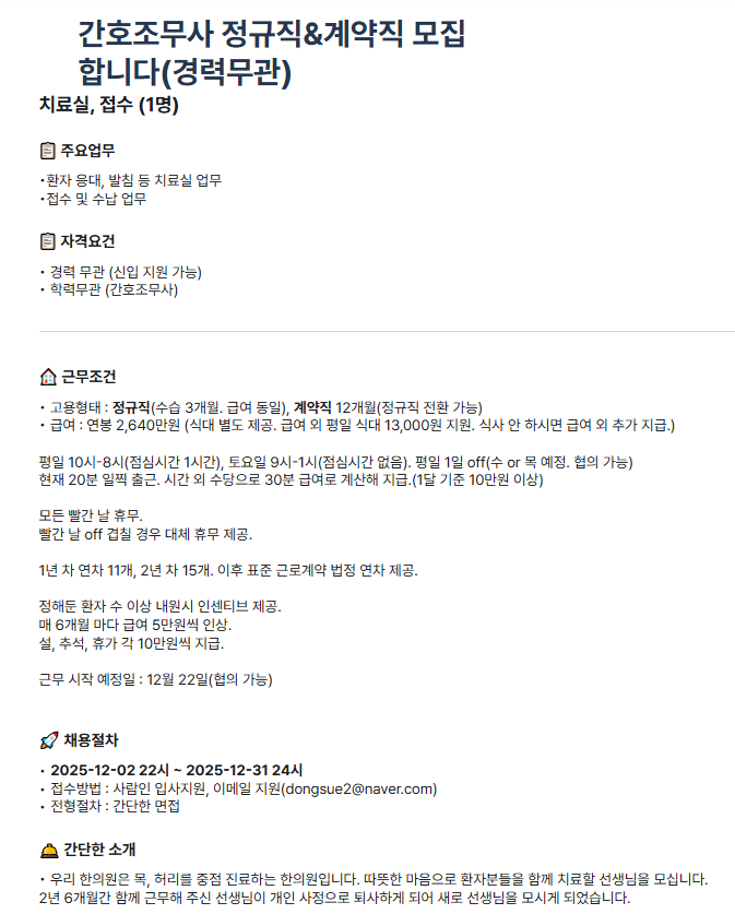 제주 이도한의원 간호조무사 선생님 모십니다. 페이지 정보 작성자 이O이 작성일25-12-09 15:59 조회584회 연락처 010-5604-0509 급여 월급 : 2200000 관련링크 본문 안녕하세요. 제주 이도한의원에서 간호조무사 선생님을 모십니다. 주소 : 제주특별자치도 제주시 승천로 81 2층 이전글 다음글 목록