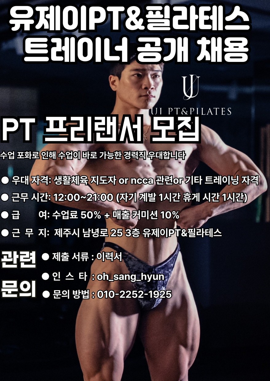 근무 장소: 제주특별자치도 제주시 남녕로 25 유제이PT&필라테스 3층