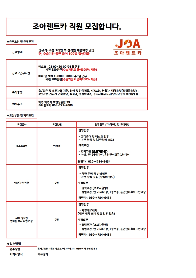 ✿˘◡˘✿ ㈜조아렌트카 데스크/배반차/세차(아르바이트포함) 정직원 모집합니다. 출퇴근/휴무 차량 지원 페이지 정보 작성자 쎄OO어 작성일25-07-28 17:51 조회1,041회 연락처 010-4784-6434 급여 월급 : 280만원 관련링크 본문 . 주소 : 제주특별자치도 제주시 오일장중길 39 조아렌트카 이전글 다음글 목록