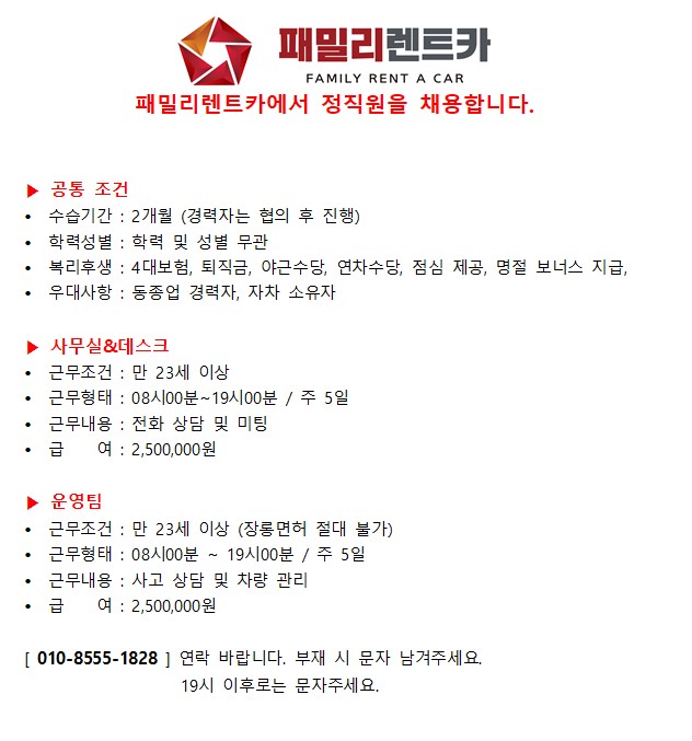 패밀리 렌트카 사무실 및 운연팀 직원 구인 페이지 정보 작성자 제OOOOOO카 작성일24-08-02 08:59 조회3,348회 연락처 010-8555-1828 급여 월급 : 250만원 관련링크 본문 연락부탁드립니다. 주소 : 제주특별자치도 제주시 제성1길 67 패밀리 렌트카 이전글 다음글 목록
