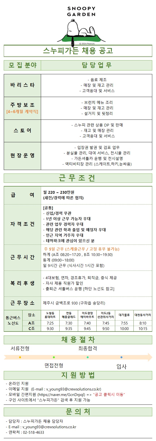 [스누피가든] 업무 별 채용 공고 페이지 정보 작성자 스OOO든 작성일24-09-12 09:40 조회3,762회 연락처 010-518-4633 급여 월급 : 230만원 관련링크 본문 간편 지원 홈페이지 : https://naver.me/GcnDrpql바리스타,주방보조,현장운영,스토어 각 1명씩 채용 주소 : 제주특별자치도 제주시 구좌읍 금백조로 930 이전글 다음글 목록