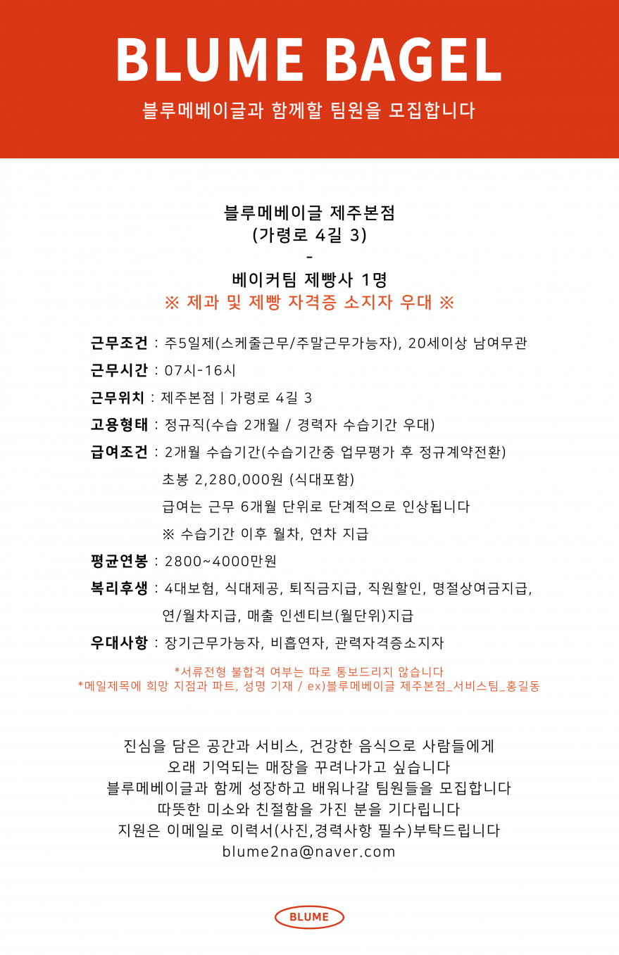 제주 블루메베이글 본점(이도점)에서 제빵사를 구인합니다:) 페이지 정보 작성자 블OOOO글 작성일25-07-22 16:47 조회1,169회 연락처 010-4419-4343 급여 협의 : 0 관련링크 본문 이력서는 이메일로 부탁드립니다:)blume2na@naver.com 주소 : 제주특별자치도 제주시 가령로4길 3 1층 블루메베이글 이전글 다음글 목록