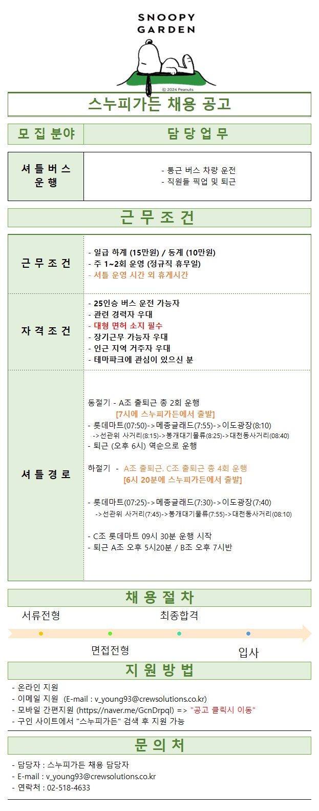 [스누피가든] 업무 별 채용 공고 페이지 정보 작성자 스OOO든 작성일24-09-09 08:53 조회4,542회 연락처 010-518-4633 급여 월급 : 2,300,000 관련링크 본문 간편 지원 홈페이지 : https://naver.me/GcnDrpql바리스타,주방보조,현장운영,스토어,셔틀아르바이트 각 1명씩 채용 주소 : 제주특별자치도 제주시 구좌읍 금백조로 930 이전글 다음글 목록