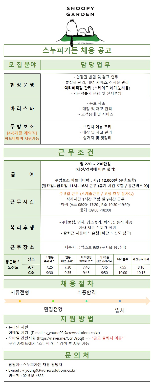 [스누피가든] 바리스타,주방보조,현장운영(매표,도슨트) 직원 모집 페이지 정보 작성자 스OOO든 작성일24-09-04 09:43 조회3,904회 연락처 010-518-4633 급여 월급 : 2,300,000 관련링크 본문 간편 지원 홈페이지 : https://naver.me/GcnDrpql바리스타,주방보조,현장운영 각 1명씩 채용 주소 : 제주특별자치도 제주시 구좌읍 금백조로 930 이전글 다음글 목록
