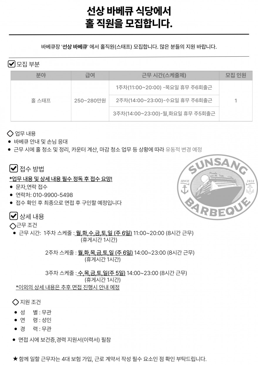 [신규오픈] 선상 바베큐에서 홀 직원을 모집합니다