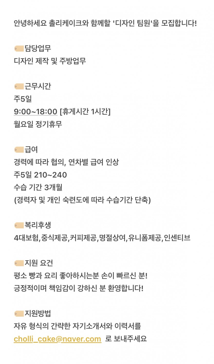 -`♥´-케이크 디자인 팀원을 모집합니다-`♥´- 페이지 정보 작성자 cOOOOe 작성일24-08-23 20:48 조회3,789회 연락처 010-0000-0000 급여 월급 : 210~240 관련링크 본문 저희 촐리케이크는 시즌별 다양한 작업을 합니다.긍정적이고, 건강한 마인드로 함께 손발을 맞춰가실 분을 찾습니다! 열정을 가지고 저희와 함께 가게를 키워나갈 많은 분들의 지원 기다리고 있겠습니다 주소 : 제주특별자치도 제주시 신설로2길 5-4 이전글 다음글 목록