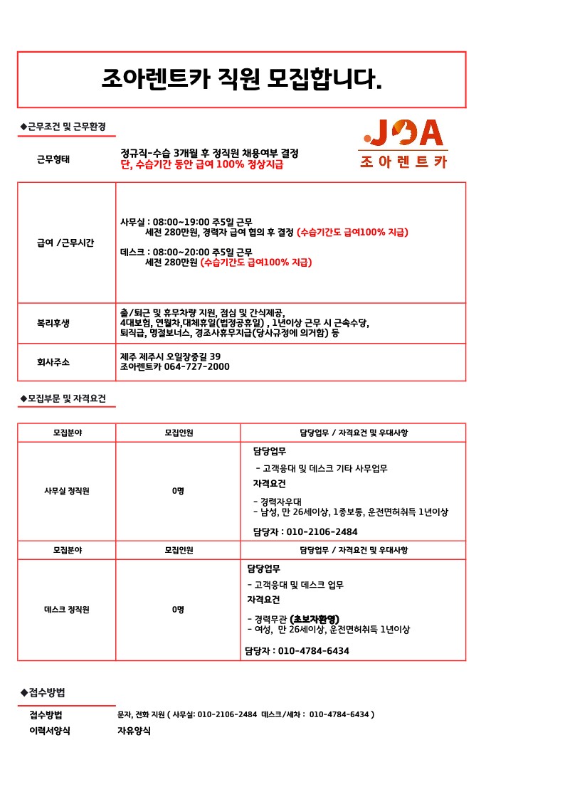 조아렌트카) 직원을 모집합니다. / 출퇴근 및 휴무차량 지원 페이지 정보 작성자 jOOOOa 작성일24-06-25 09:31 조회3,960회 연락처 010-4784-6434 급여 월급 : 280만원 관련링크 본문 . 주소 : 제주특별자치도 제주시 오일장중길 39 조아렌트카 이전글 다음글 목록