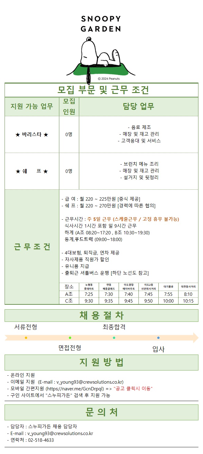 [스누피가든] 바리스타 및 레스토랑 셰프 정규직 모집