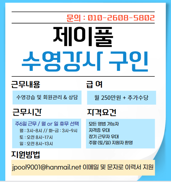 어린이 수영장 강사 정직원 채용공고 페이지 정보 작성자 스O프 작성일24-08-16 10:04 조회3,740회 연락처 010-2608-5802 급여 월급 : 250만원 + @ 관련링크 본문 어린이 수영장 제이풀입니다.아이들과 즐겁게 수영강습 해주실 선생님을 구인합니다아이들에게 수영강습을 하고 싶은 젊은 청년들도 지원 가능합니다.영법 및 강습 교육을 통해 교육기간 이수 후 정직원 채용이 가능합니다. 주소 : 제주특별자치도 제주시 연화남길 22 이전글 다음글 목록