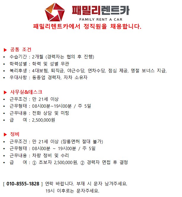 ★패밀리렌트카 사무실 마지막 직원 구인 페이지 정보 작성자 패OOOO카 작성일24-06-18 12:05 조회4,812회 연락처 010-8555-1828 급여 월급 : 250만 관련링크 본문 연락주세요. 주소 : 제주특별자치도 제주시 제성1길 67 패밀리렌트카 이전글 다음글 목록