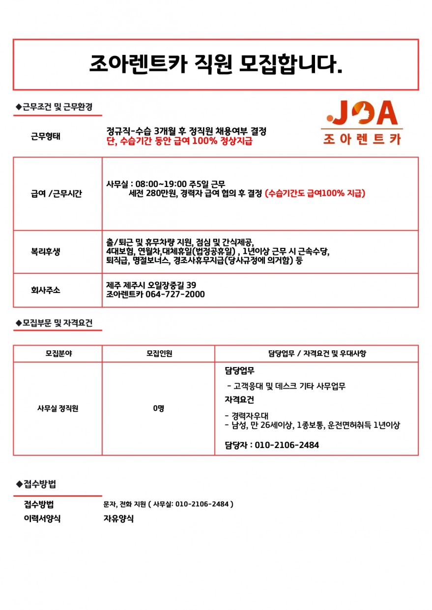 조아렌트카) 직원을 모집합니다. / 출퇴근 및 휴무차량 지원 페이지 정보 작성자 jOOOOa 작성일24-06-16 09:03 조회3,915회 연락처 010-2106-2484 급여 월급 : 280만원 관련링크 본문 . 주소 : 제주특별자치도 제주시 오일장중길 39 조아렌트카 이전글 다음글 목록