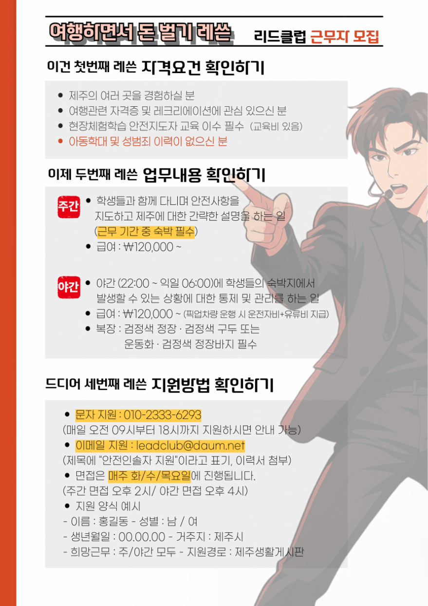 ☆제주_수학_여행_인솔자_근무자구인☆!!!& 페이지 정보 작성자 차OO만 작성일25-09-28 18:00 조회194회 연락처 010-5227-3021 급여 일당 : 130,000 관련링크 본문 주소 : 노연로 55 4층 이전글 다음글 목록