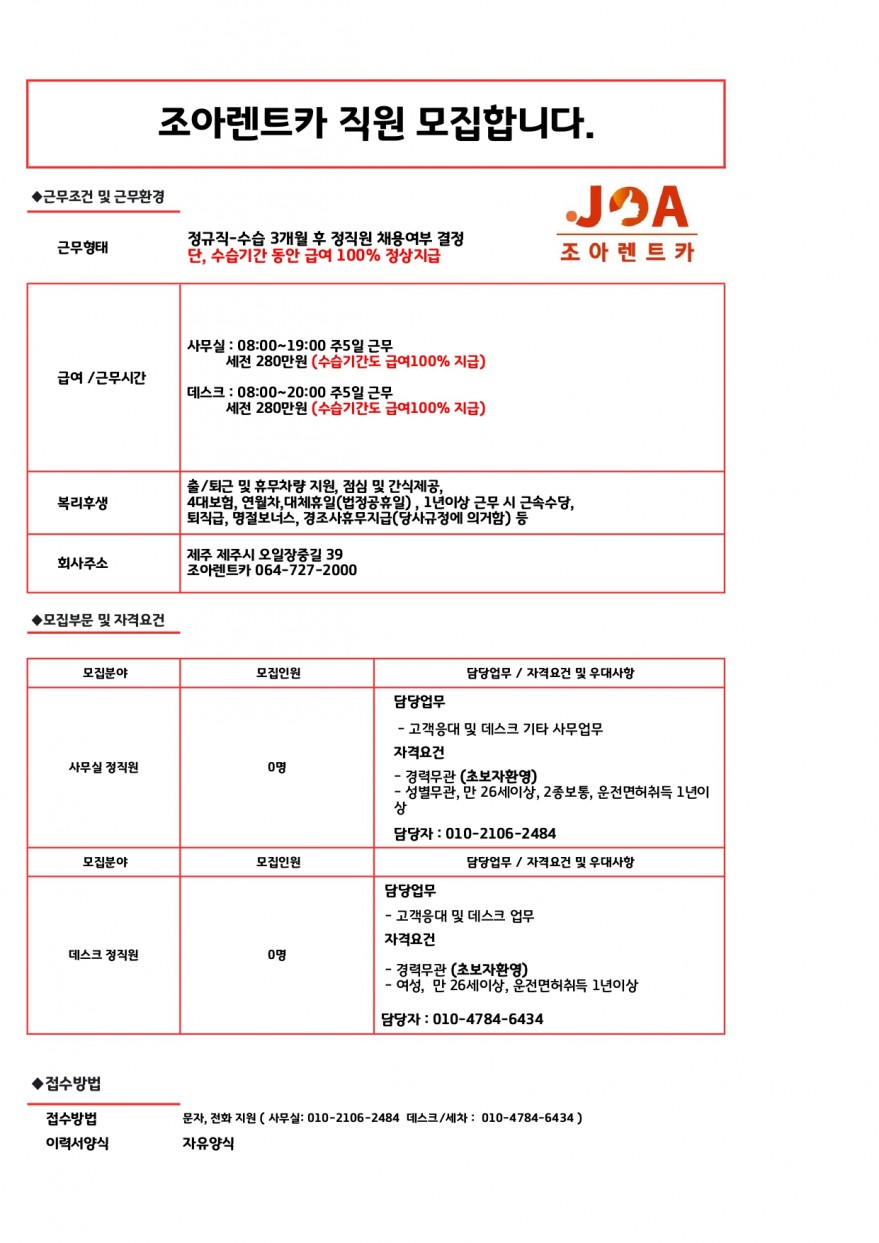 조아렌트카에서 직원을 모집합니다/출퇴근,휴무차량지원/ 페이지 정보 작성자 jOOOOOt 작성일24-08-14 13:51 조회3,544회 연락처 010-4784-6434 급여 월급 : 280만원 관련링크 본문 . 주소 : 제주특별자치도 제주시 오일장중길 39 조아렌트카 이전글 다음글 목록