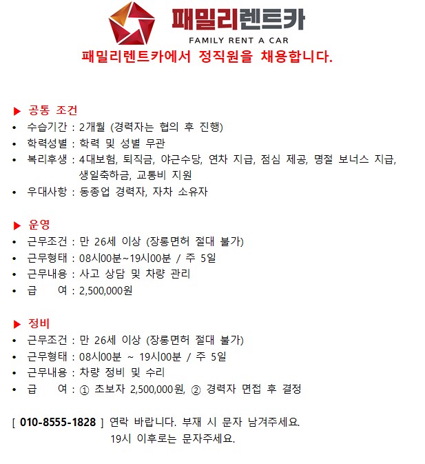 패밀리렌트카 운영팀&정비팀 구인 페이지 정보 작성자 패OOOO카 작성일24-08-14 13:21 조회3,673회 연락처 010-8555-1828 급여 월급 : 250만 관련링크 본문 연락주세요. 주소 : 제주특별자치도 제주시 제성1길 67 패밀리렌트카 이전글 다음글 목록