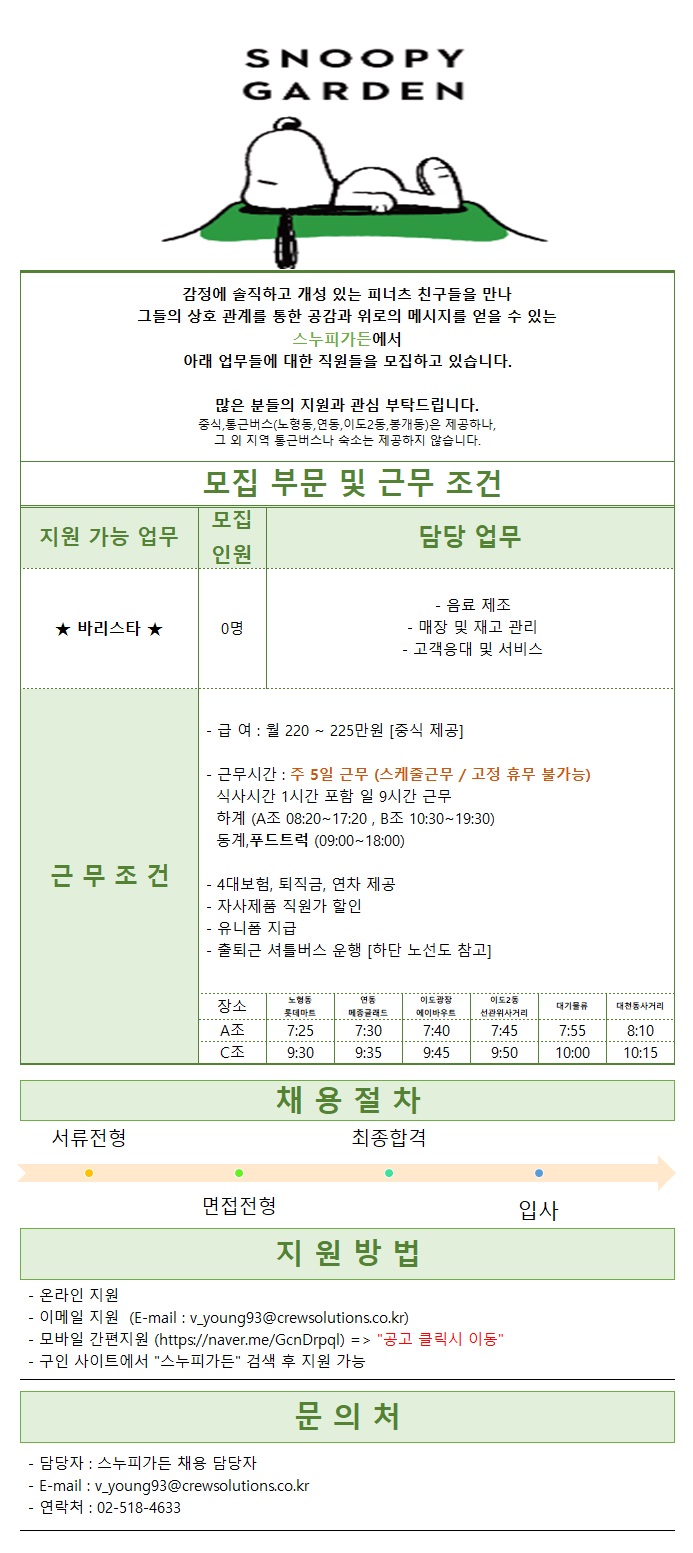 - 근무시간 : 주 5일 근무 (스케줄근무, 휴일근무 가능자)