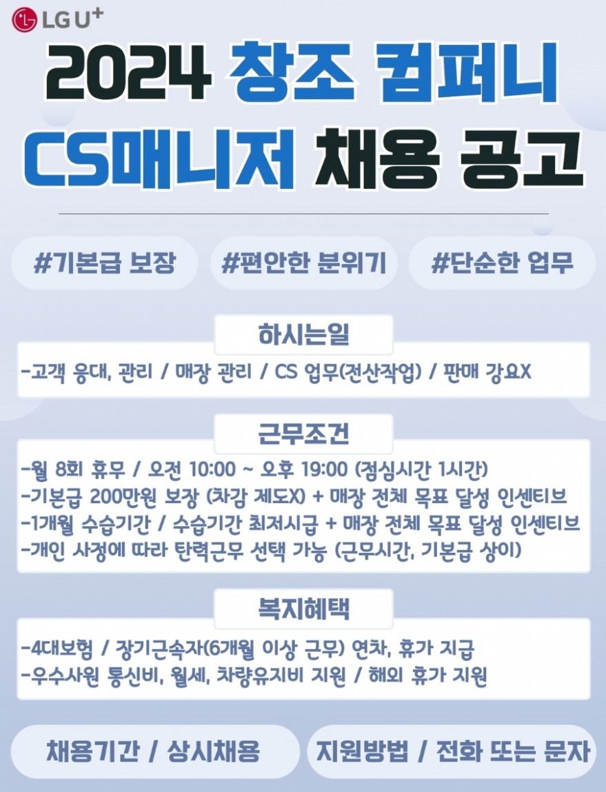 채용인원 : CS매니저 2명 경리직원 : 1명 (경리직원은 시간 조율 가능)