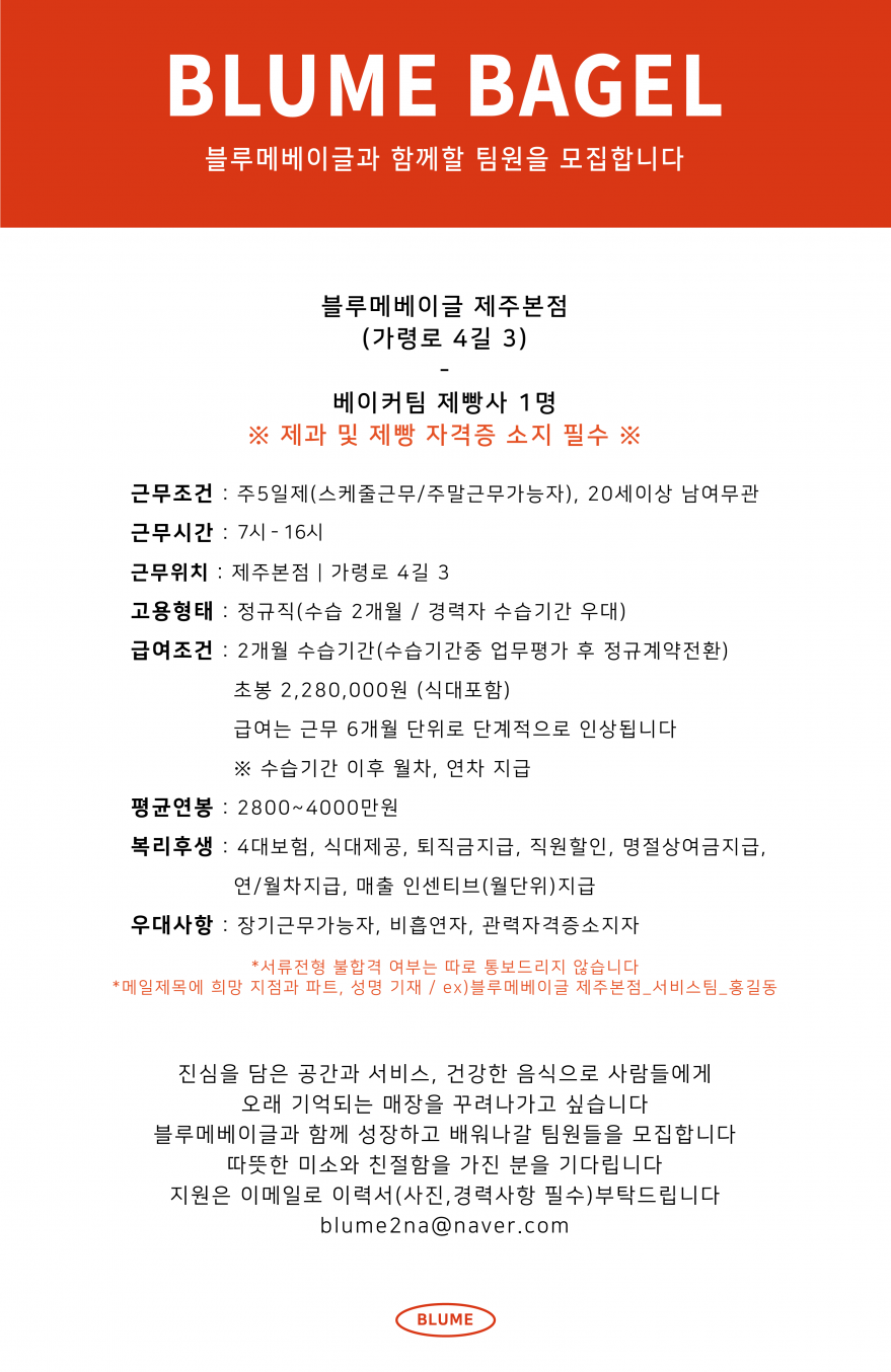블루메베이글에서 제빵사를 구인합니다:) 페이지 정보 작성자 블OOOO글 작성일25-06-17 10:49 조회1,009회 연락처 010-4419-4343 급여 협의 : 0 관련링크 본문 블루메베이글 본점(가령로4길3)에서 제빵사를 구인합니다:)자세한 내용은 아래 공고를 참고해주세요.이력서는 blume2na@naver.com 으로 보내주세요. 주소 : 제주특별자치도 제주시 가령로4길 3 1층 블루메베이글 이전글 다음글 목록
