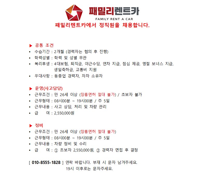 패밀리렌트카 정직원 채용 페이지 정보 작성자 패OOOO카 작성일25-06-12 09:18 조회1,127회 연락처 010-8555-1828 급여 월급 : 255만 관련링크 본문 연락주세요 주소 : 제주특별자치도 제주시 제성1길 67 이전글 다음글 목록