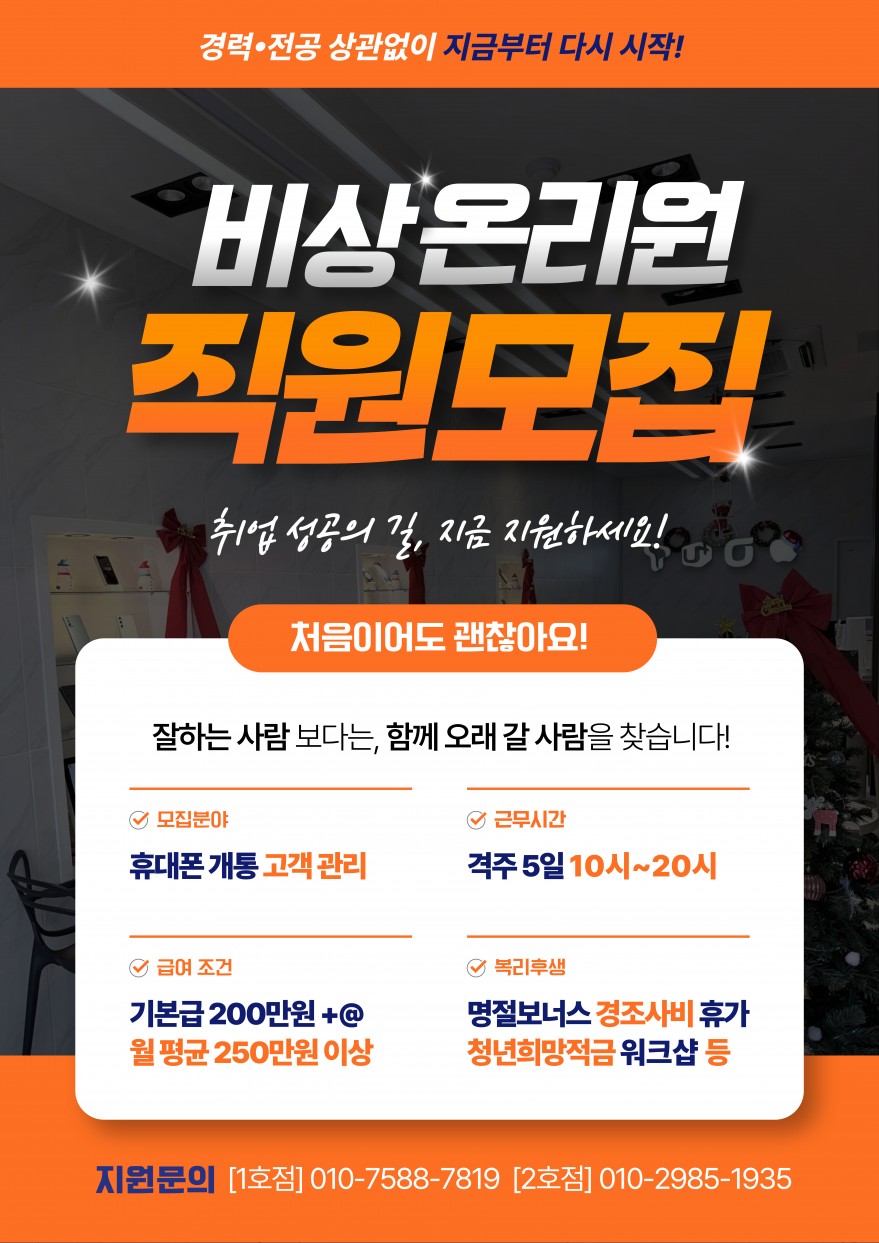 통신3사휴대폰⭐️비상!OnlyOne⭐️직원모집 페이지 정보 작성자 아O라 작성일25-12-26 16:12 조회149회 연락처 010-7588-7819 급여 월급 : 250만원 이상 관련링크 본문 - 주소 : 제주 제주시 월랑로 8길 1 이전글 다음글 목록