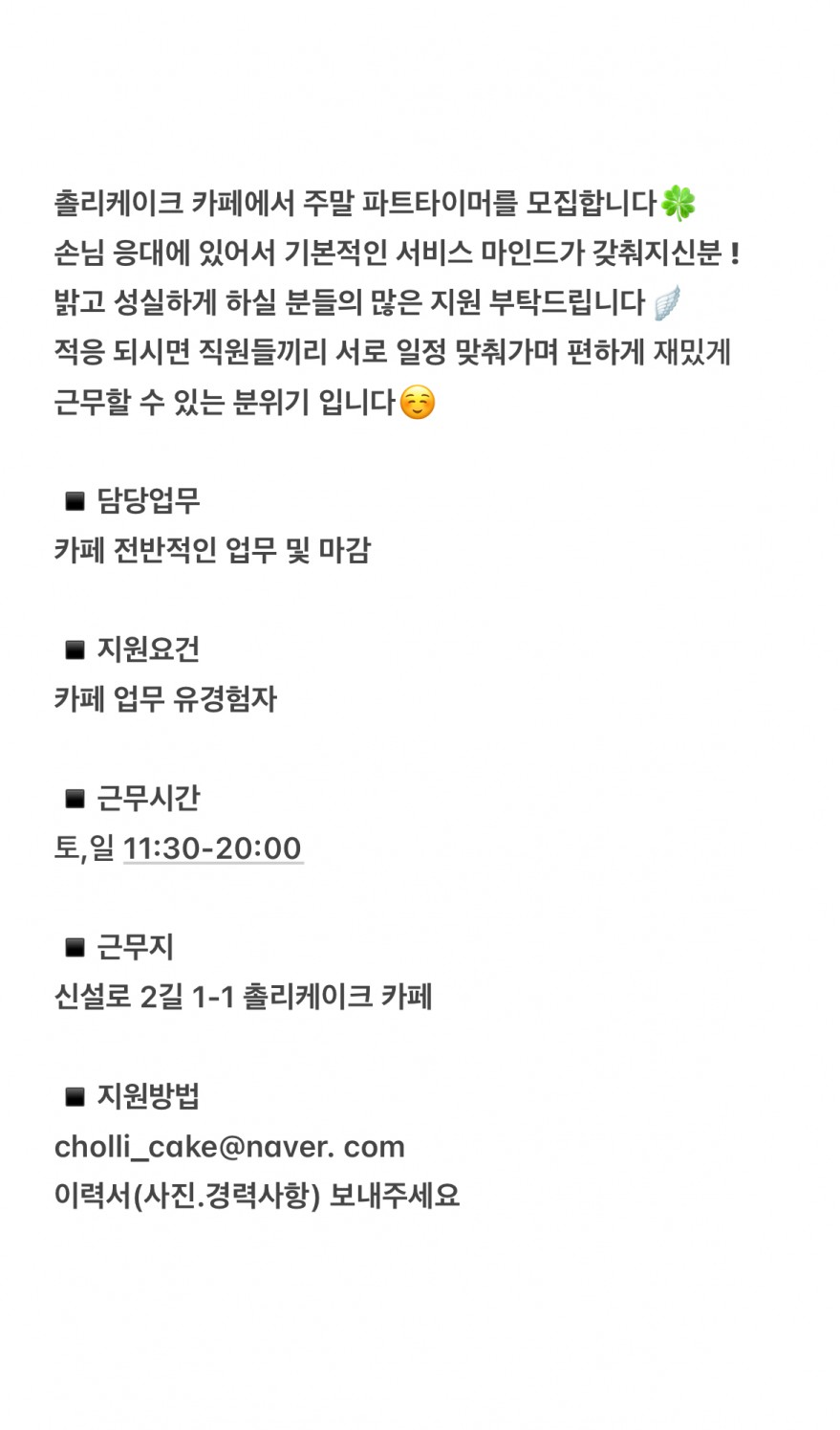 촐리케이크 주말 풀타임 파트타이머 구합니다 페이지 정보 작성자 cOOOOe 작성일25-06-10 21:49 조회1,472회 연락처 010-000-000 급여 시급 : 11,000 관련링크 본문 주소 : 신설로2길1-1 이전글 다음글 목록