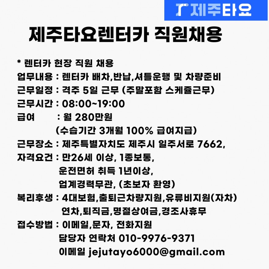 [제주타요렌터카] 배반차 정직원 채용 페이지 정보 작성자 구인 작성일25-05-22 13:37 조회1,177회 연락처 010-9976-9371 급여 월급 : 2,800,000 관련링크 본문 1 주소 : 제주특별자치도 제주시 일주서로 7662 이전글 다음글 목록