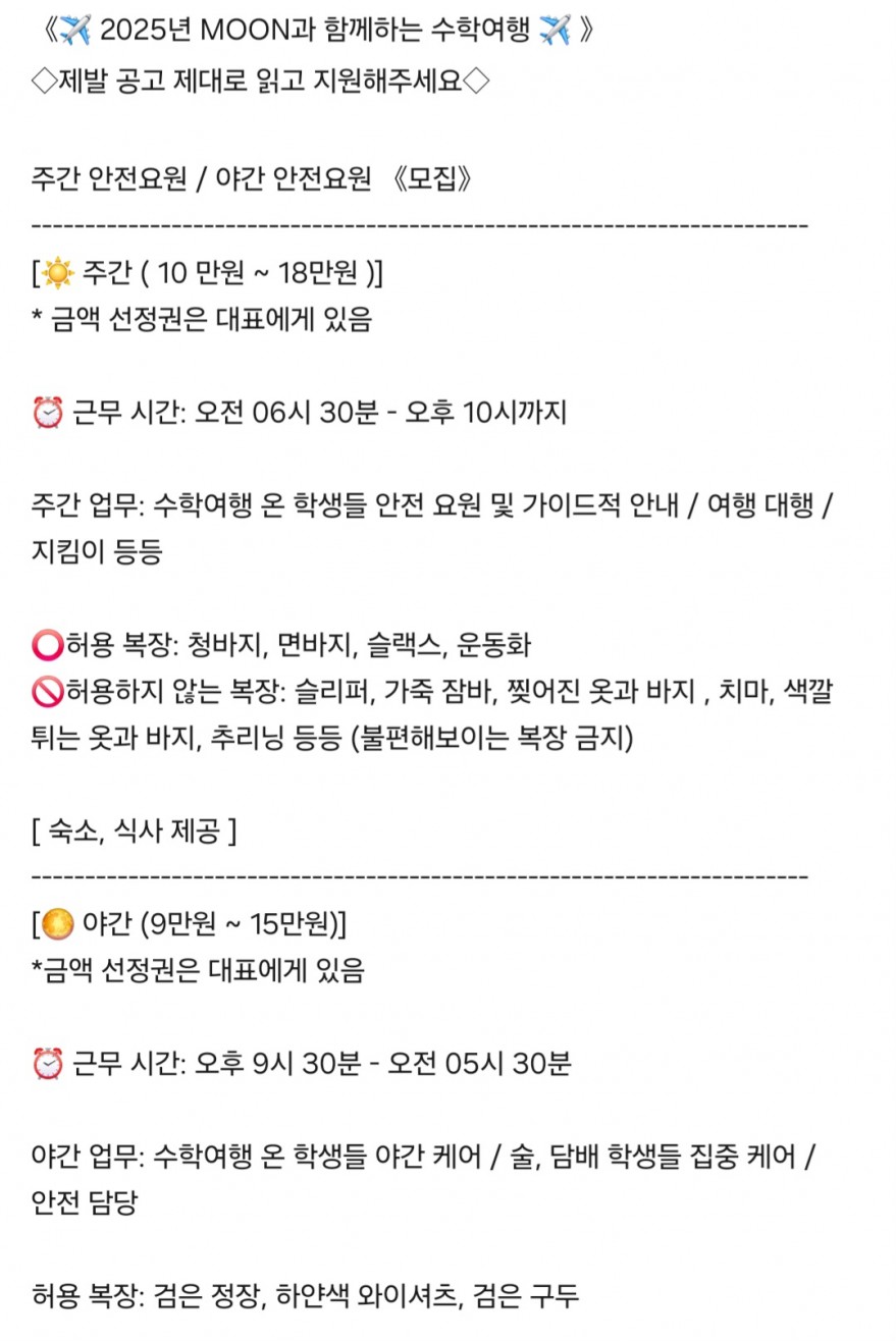 5월부터 함께할 수학여행 인솔자 구합니다 ! 페이지 정보 작성자 tOOO2 작성일25-04-21 13:30 조회1,473회 연락처 010-9922-1325 급여 협의 : 100,000 관련링크 본문 많은 지원바랍니다 ! 010 9922 1325 전화 문자 편하신걸로 연락주세용 주소 : 제주특별자치도 제주시 공항로 2 제주국제공항 이전글 다음글 목록