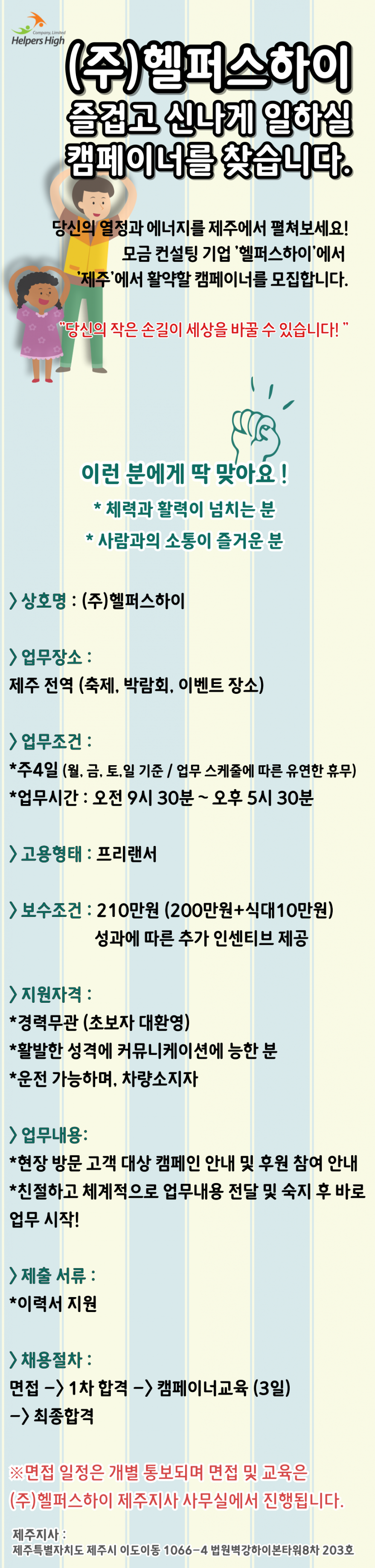 (주4일제) 제주 캠페이너 채용/ 즐겁고 신나게 일하실 분을 찾습니다 페이지 정보 작성자 hOOOOOOOOOh 작성일25-04-21 11:31 조회1,438회 연락처 010-2614-9020 급여 월급 : 210000 관련링크 본문 *지원 방법 0 10-2614-9020 (이름, 나이, 사는곳 작성하여 문자 지원 부탁드립니다.) 주소 : 제주특별자치도 제주시 이도이동 1066-4 이전글 다음글 목록