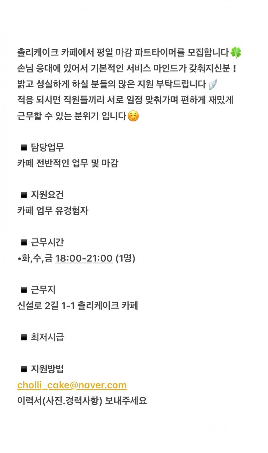 카페 평일 마감 파트타이머 모집합니다 ~~! 페이지 정보 작성자 cOOOOe 작성일25-04-07 17:51 조회1,622회 연락처 010-3910-0327 급여 시급 : 10030 관련링크 본문 주소 : 신설로2길1-1 이전글 다음글 목록