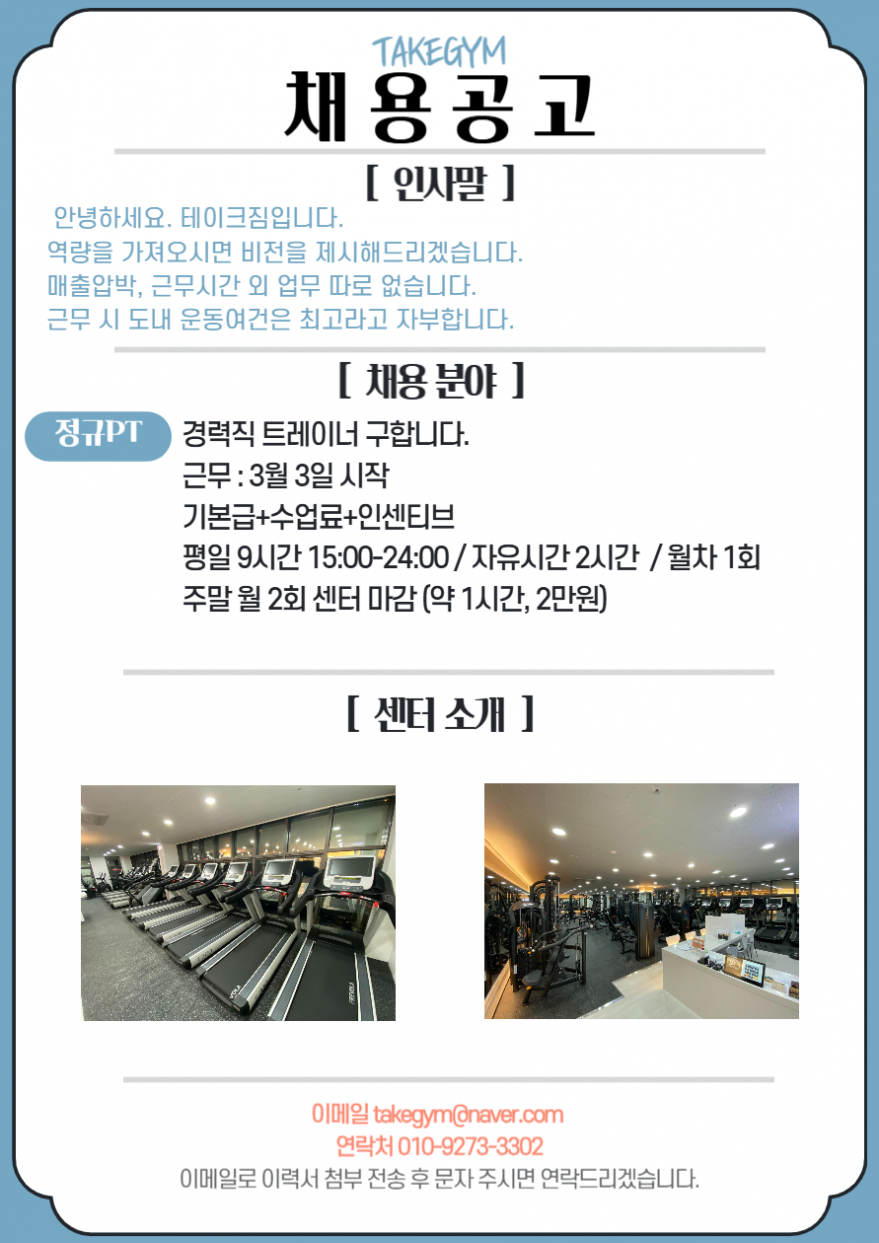 테이크짐 경력직 트레이너 구인합니다^^ 페이지 정보 작성자 테OO짐 작성일25-04-07 09:11 조회1,618회 연락처 010-3464-3187 급여 협의 : 협의 관련링크 본문 안녕하세요 테이크짐입니다. 경력자 트레이너 구인합니다. 내용은 첨부된 이미지 확인 부탁드리며, 주말 마감은 21시 전후로 약 10-20분 정도면 됩니다! 지원을 원하는 분은 문자주세요^^ 주소 : 제주특별자치도 제주시 노연로 43 3층 테이크짐 이전글 다음글 목록