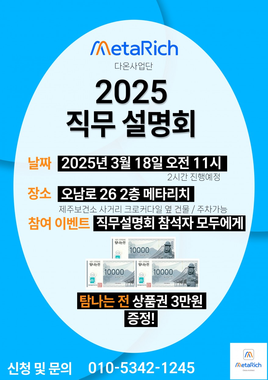 직무설명회 참여하고 탐나는 전 받자! 페이지 정보 작성자 메OO온 작성일25-03-17 10:33 조회1,550회 연락처 010-5342-1245 급여 일당 : 30000 관련링크 본문 총 진행 시간 2시간입니다.탐나는 전 3만원과 점심 제공됩니다. 주말에도 참가 연락 받습니다. 문의 문자 및 전화 편하게 해주세요! 주소 : 제주특별자치도 제주시 오남로 26 2층 메타리치 이전글 다음글 목록